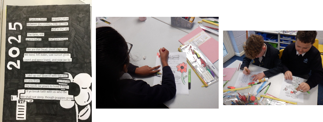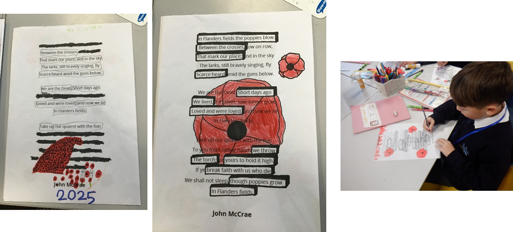 In addition to our cosmic adventures, we honoured Remembrance Day by creating blackout poetry inspired by Flanders Fields. The children skillfully selected words from existing texts, and with a keen eye, transformed them into poignant messages that pay tribute to those who served. It was heartwarming to see them engage with such an important theme, combining artistry with reflection. Each poem resonated with a sense of respect, reminding us of the significance of remembrance. Overall, this week was a beautiful blend of creativity and contemplation in our poetry journey! Next week, the children will be working on retelling a part of the story as a playscript.