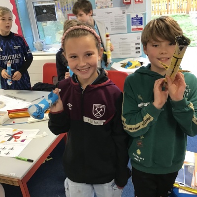 In pairs, the students set to work designing their very own rockets, showcasing their imagination and teamwork skills. After a thrilling demonstration, they built two of their designs and took them to our test space for launch. Each child had the chance to mark where their rocket landed with their name, adding an element of friendly competition!