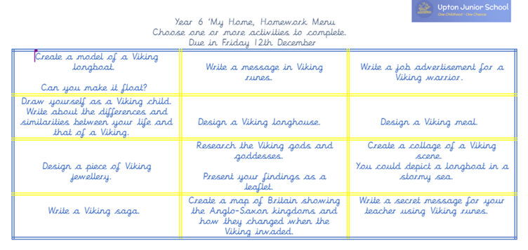 - Thematic Homework: Choose from the homework menu and complete tasks in the provided book.
